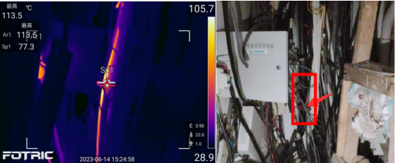 近日,阳光财险的风控工程师前往某三甲医院,通过红外检测服务,发现住院楼8楼弱电井线路温度明显偏高,热点最高温达113.5℃。当负荷增大或环境温度升高时,热点温度将会更高。风控工程师立即通知客户,安排电工进行电路整改,有效避免了电路火灾险情的发生。