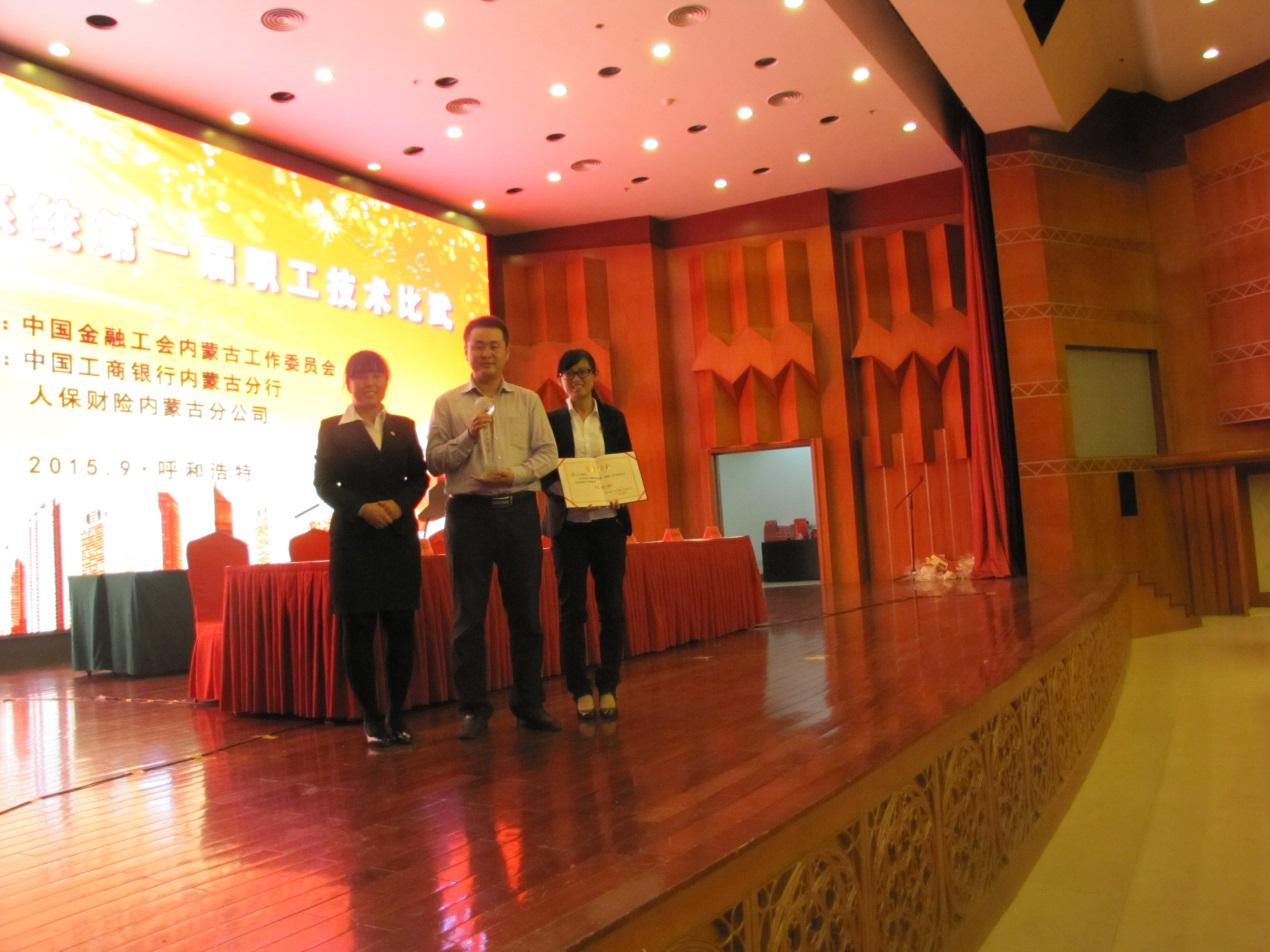 经过一天紧张激烈的角逐,内蒙古分公司在27家参赛机构中脱颖而出,取得骄人成绩,获得两项殊荣,分别是保险专业知识竞赛团体二等奖和保险专业演讲个人优秀奖,由内蒙古银监局副局长、中国金融工会内蒙古工作委员会主任贾奇珍为获奖者颁奖。荣誉的获得离不开选手的努力,更离不开领导的指导,今天的荣誉充分表明努力付出是一种真正的获得!友谊第一、比赛第二,比赛中我们同行结下的深厚友谊弥足珍贵,倍感珍惜。