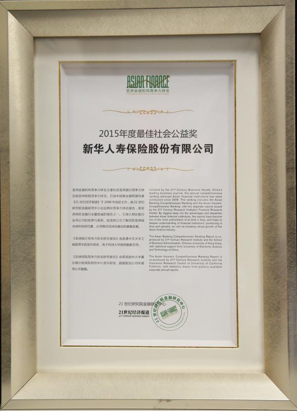 第十届21世纪亚洲金融年会暨2015年亚洲保险竞争力排名研究报告发布仪式日前在京举行,报告显示,在10个亚洲国家和地区的243家寿险公司中,新华保险竞争力排名亚洲寿险第五,中国寿险公司第四,并再次荣获“最佳社会公益奖”。