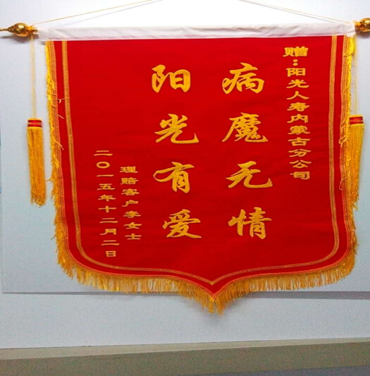 病魔无情、阳光有爱,为感谢阳光人寿对理赔客户的关爱,李女士于12月2托朋友连夜制作了一面锦旗,12月3日一早携家人将锦旗送到了公司,对公司履行合同承诺、快速理赔的行为赞不绝口。