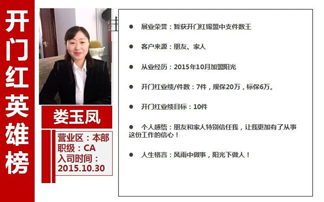 在此次开门红战役中,涌现出一批批先进业务人员,锡盟中支开门红业绩榜前5名都被锡盟本部包揽。位列第一的,是2015年10月新加盟阳光的娄玉凤伙伴,在开门红战役中,以承保“创富一号”产品7件,规模保费20万稳居第一名。她表示这样的成绩离不开家庭和朋友的支持,让她更有展业信心,同时,娄玉凤伙伴也正在为更高的目标冲刺,为锡盟中支全体人员树立的榜样,成为人人追逐和学习的楷模!