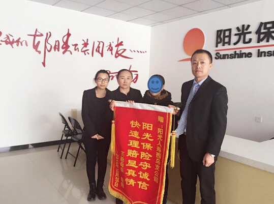 12月25日宋女士心怀感激之情来到西乌支公司,为表示感谢特意委托广告公司连夜制作锦旗。宋女士在送锦旗时激动的说:“阳光公司真是一家守诚信的公司,真正做到了把客户装在心里;也让我感受到了阳光保险高效、优质的服务。”