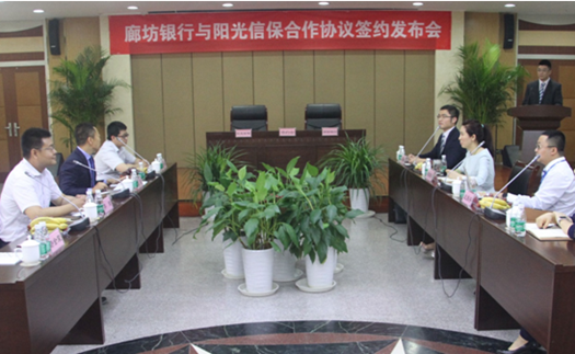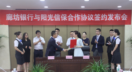 近日,国内首家市场化专业信用保证保险公司—阳光渝融信用保证保险股份有限公司(简称“阳光信保”)与目前国内资产增速最快的廊坊银行正式签署全面业务合作协议。阳光信保总裁张见与廊坊银行行长邵丽萍进行了友好的会谈并出席了当天的签约仪式。