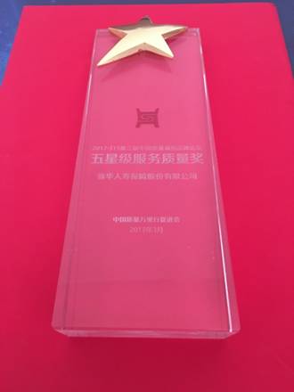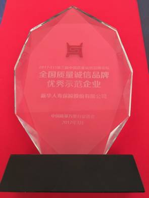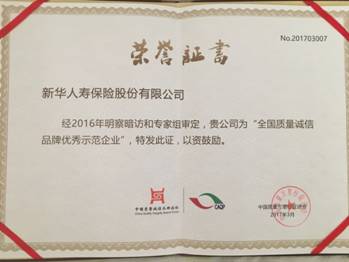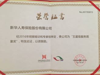 2016年,中国质量万里行促进会对全国26个行业的诚信、质量情况进行明查暗访,并结合社会评价,由专家组审定后,在论坛现场发布审核结果。新华保险从1900余家企业的激烈角逐中脱颖而出,再度荣膺“全国质量诚信品牌优秀示范企业”和“五星级服务质量奖”两项大奖,成为唯一一家同时获得两项殊荣的保险公司。