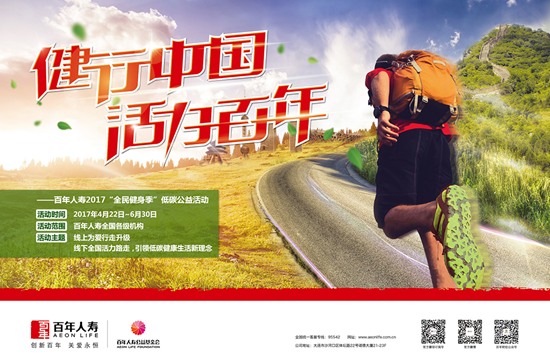 作为健康生活方式的坚定倡导者,百年人寿正召集更多的人加入健走队伍。4月22日,百年人寿2017年“全民健身季”低碳公益活动正式启动。本届活动以“健行中国,活力百年”为主题,携全新升级的“为爱行走”APP,精彩好玩的线上线下活动与缤纷壕礼,及如约而至的健康大讲堂、全新推出的“康悦一生”健康险产品,全力打造一场贯通春夏的全民健康盛宴,共同践行低碳生活理念,打造健康生活方式。