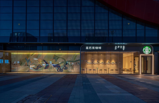 站在门店之外,宽阔大气的门面设计格外吸引来往行人的目光。汉、蒙两种文字与星巴克美人鱼的设计,不仅体现了传统文字设计与现代商业的传承与融合,更是传递着这是一家极具内蒙古风情的第三空间。左侧两条翩翩起舞的美人鱼彷佛在热烈欢迎顾客的到来,别具一格的橱窗设计,简洁的展架及桌椅搭配温馨而不失典雅。尤其是夜幕降临之时,城市夜景与美人鱼玻璃幕墙相映成趣,宛如“海市蜃楼”般的时空美景。