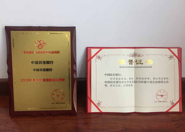 2015年10月9日,“第四届社交网络营销金蜜蜂奖颁奖盛典”在北京顺利落下帷幕,中国民生银行官方微信公众账号凭借出色的微金融服务和跨界整合营销,从众多企业微信公众号中脱颖而出,获评“2015年度中国十佳企业微信公众账号”并荣登十佳榜首。