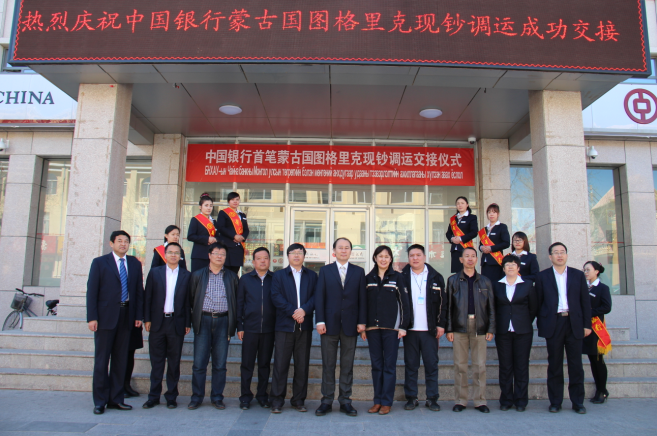 4月5日,经人民银行和蒙古央行批准,中国银行二连浩特市分行从蒙古郭勒蒙特银行调运1亿蒙古图格里克(以下简称蒙图)现钞,成功实现了我行首笔由境外调运蒙图现钞。