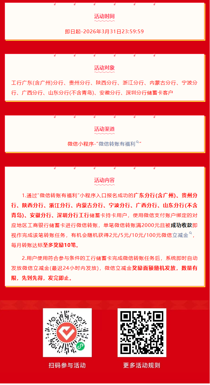 【微信转账有礼】微信转账用工行卡,至高得1000元立减金!