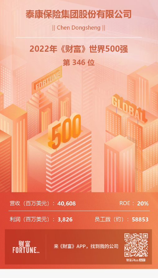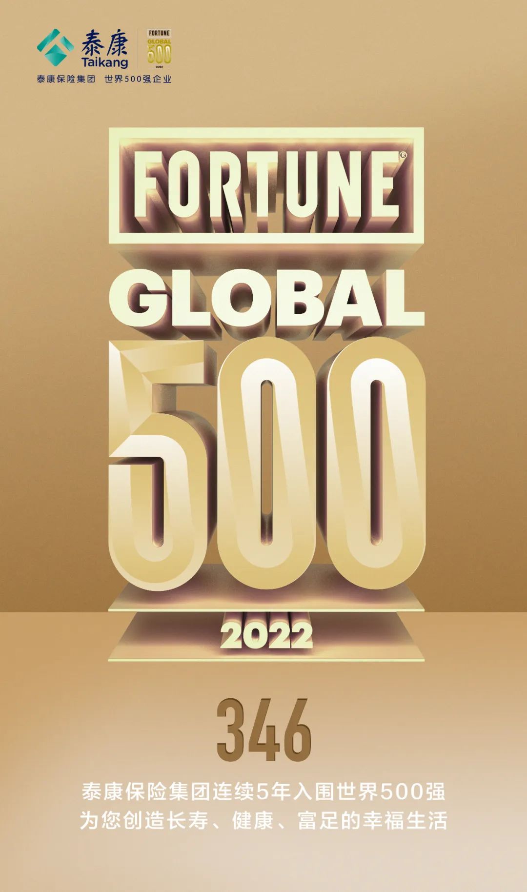 8月3日,2022年《财富》世界500强排行榜正式发布。泰康保险集团以406.077亿美元的营业收入,位列榜单第346名。自2018年首次跻身世界500强以来,泰康保险集团已连续五年上榜。据了解,截至2021年底,泰康累计服务个人客户4.2亿人,累计理赔金额超1000亿元,累计纳税金额超750亿元。