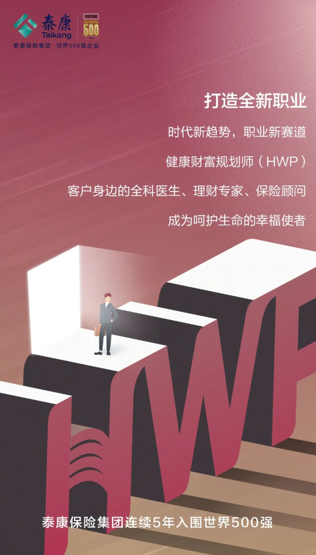 长寿时代背景下,泰康依托四位一体大健康战略,首创全新职业——健康财富规划师(HWP-Health & Wealth Planner)。他们是客户身边的全科医生、理财专家和保险顾问。业内专家评价道:这个职业的诞生顺应了长寿时代中高净值人群的高质量服务需求,也符合快速发展的大健康行业对专业人才的要求,未来发展空间巨大。平台之上,万物生长。健康财富规划师是“长寿时代,泰康方案”商业模式下诞生的全新职业,也是泰康对中国大健康事业的独特贡献,帮助人们解决长寿时代带来的挑战。泰康连续5年荣登世界500强的实力和大健康产业生态布局,赋予这支职业化的健康财富规划队伍广阔的发展空间,助推其成为金融行业可以和律师、医生等比肩的标杆职业。
