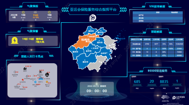 中国太保在杭州成立亚运会保险服务指挥中心,打造集视频指挥调度、线上自助理赔、远程责任认定、视频人伤调解、线上直赔垫付、重大案件在线会商等于一体的指挥调度体系,以“数智”大脑破解现场触达难、指挥调度难、信息获取难等问题。