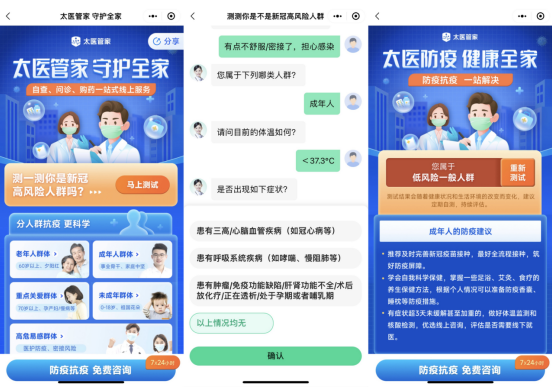 太医管家CEO徐晶表示,为积极响应国家疫情防控政策的优化调整,太医管家上线了抗疫服务专区,希望通过自我评测和科学指导,帮助用户减轻心理压力,在保持正常生活节奏的前提下实现科学化、精准化抗疫,共同迎接最终的胜利。