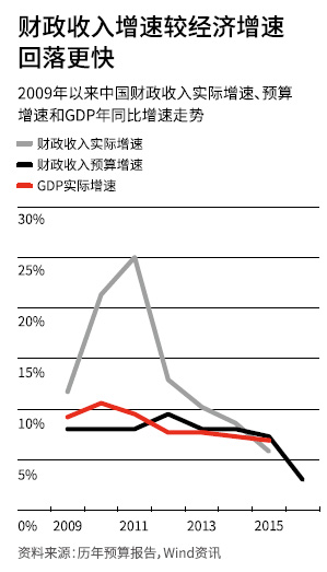 赤字增加的一个现实背景是,近年来财政收入增速持续下滑。去年全国一般公共预算收入同口径增长5.8%,低于7.3%的预算增长目标,为1988年以来最低。根据全国财政预算报告,2016年全国一般公共预算收入15.72万亿元,增长仅3%。