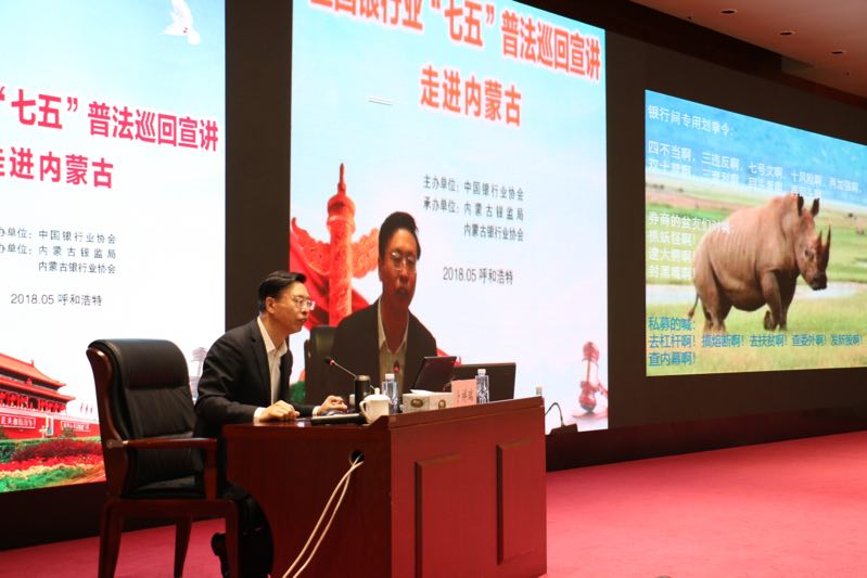 为深入贯彻落实党中央、国务院依法治国方略,进一步推动我区银行业“七五”普法工作,2018年5月28日,由中国银行业协会主办,内蒙古银监局、内蒙古银行业协会承办的全国银行业“七五”普法巡回宣讲走进内蒙古活动在呼和浩特市成功举办。中国银行业协会法务总监卜祥瑞和工商银行总行法律事务部副总经理余保福特邀作主题宣讲。宣讲专家分别在内蒙古银监局和工商银行内蒙古自治区分行举办了两场宣讲活动,并通过视频会议系统延伸到各盟市,全区银监局系统干部和各政策性银行、国有商业银行、邮政储蓄银行、股份制商银行、城市商业银行、部分农村金融机构以及非银行金融机构负责风险管理、合规管理、法律事务、不良资产化解等相关工作的行级领导、部门负责人、业务骨干1200多人参加了宣讲活动,认真聆听了专家的宣讲。内蒙古银监局、内蒙古银行业协会有关领导参加了本次宣讲活动并致辞。