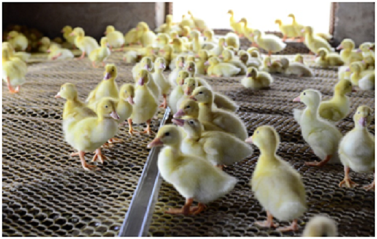 走进鸭舍,一阵清脆的喊鸭声传了过来。正值晌午,张艳春在给雏鸭喂食,刚接雏6天的小雏鸭跌跌撞撞地向食槽蜂拥过来,场面很是热闹。