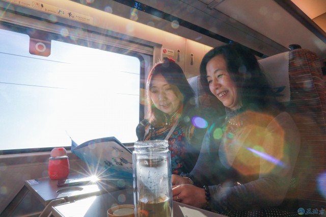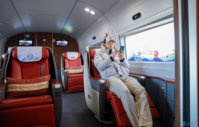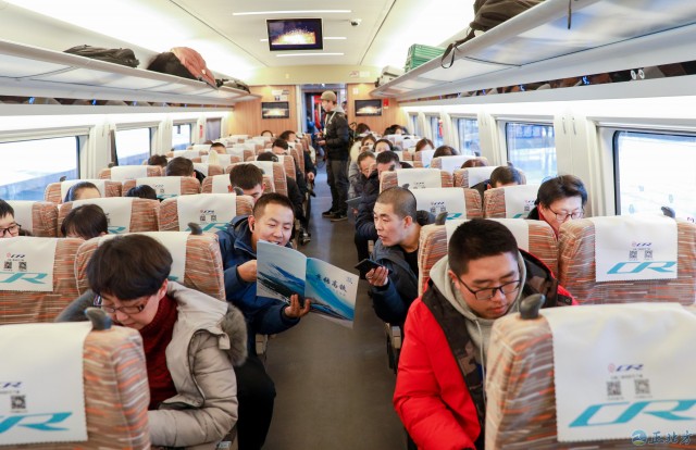 14时40分,高铁列车准点发车。虽然当日气温极低,但是车厢内却温暖如春。全车编组8辆,设有商务座、一等座、二等座车厢和餐车,车厢内WIFI全覆盖,有USB接口和电源接口,非常方便旅客办公及娱乐,乘车体验可打满分。记者们从上车就开始忙碌着采访写稿,不知不觉过了一个又一个站点。