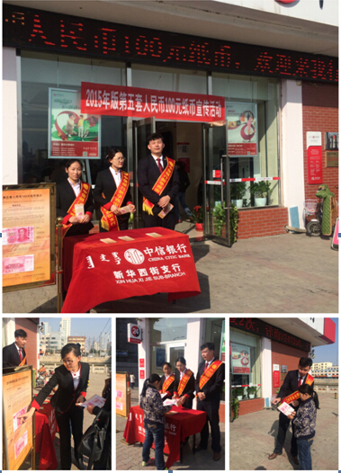 为了配合人民银行做好第五套人民币2015年版100元纸币发行工作,提高社会公众对新版人民币的认知和防伪辨假能力,中信银行呼和浩特新华西街支行于2015年10月15日开展了2015版第五套人民币100元纸币宣传活动。