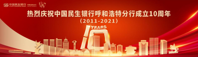 北疆十年,民生耕耘,时代催征,筑梦启航。迈向新的十年,中国民生银行呼和浩特分行将继续坚持党建引领,在思想和行动上全面融入内蒙古自治区经济发展大局,用忠诚诠释金融工作者的使命担当,以更加坚定的步伐,迎接下一个十年,以更加昂扬的姿态,拥抱下一个十年,以更重的责任担当,启航下一个十年,为地区经济社会发展贡献民生智慧、民生力量!