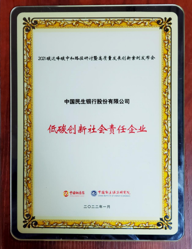 1月7日,由中国能源报社主办的“2021碳达峰碳中和路径研讨暨高质量发展创新案例发布会”在京举行,民生银行凭借在绿色金融方面的突出表现,荣获“2021年低碳创新社会责任企业”重要奖项。