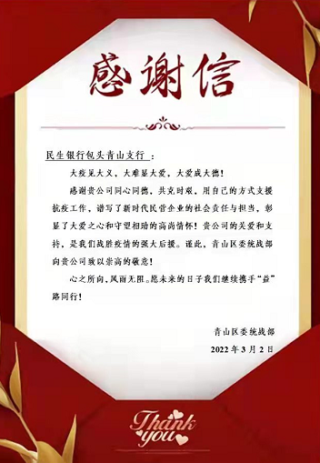 3月2日,民生银行包头二级分行收到了来自包头市青山区委统战部的一封感谢信。信中,包头市青山区委统战部感谢民生银行同心同德、共克时艰、支援抗疫,谱写了新时代民营企业的社会责任与担当,彰显了大爱之心和守望相助的高尚情怀。