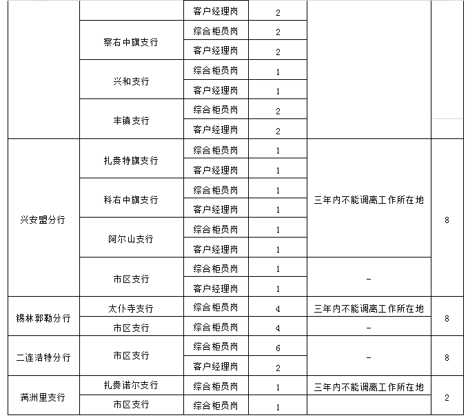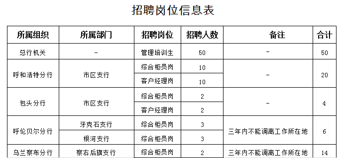 管理培训生50人,客户经理、综合柜员70人,共120人。具体招聘岗位及工作地点见下表。