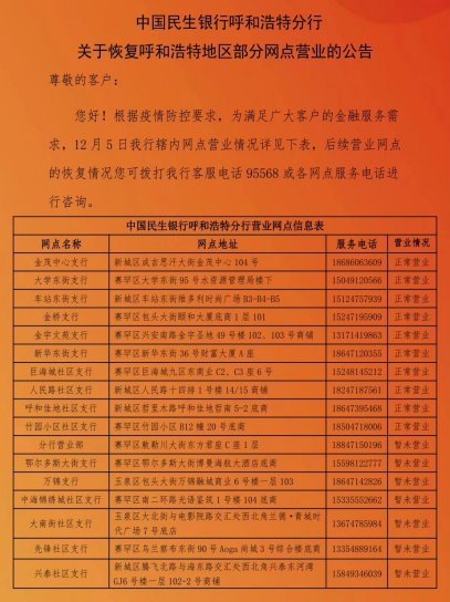 12月5日,民生银行呼和浩特分行十家营业机构恢复对外营业,成为本轮疫情以来呼和浩特地区首批复工复产的银行机构。