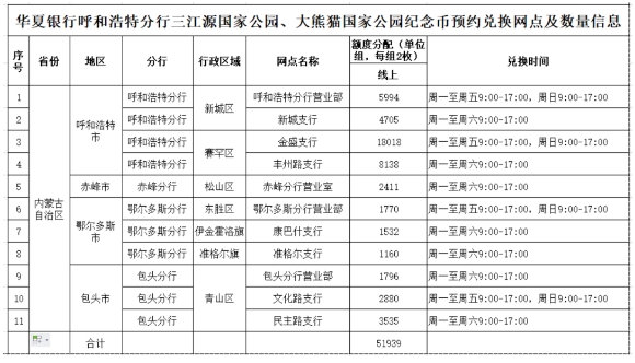 为便于公众了解2023年贺岁、世界文化和自然遗产—黄山、世界文化和自然遗产—峨眉山-乐山大佛、三江源国家公园、大熊猫国家公园普通纪念币(以下分别简称2023年贺岁币、黄山币、峨眉山币、三江源币、大熊猫币)等五种普通纪念币华夏银行呼和浩特分行余量兑换工作安排,现将有关事项公告如下: