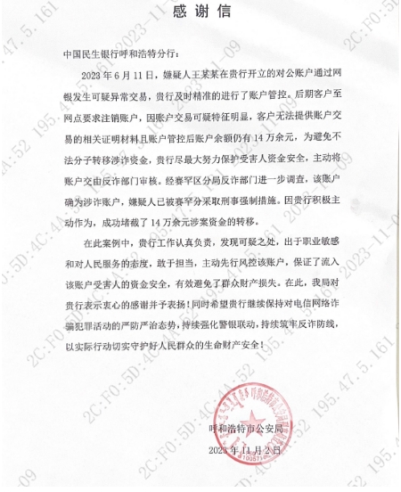 呼和浩特市公安局刑事侦查大队高度肯定我行精准研判、精准打击涉诈可疑账户的举措,对我行主动先行风控可疑账户,积极为公安机关提供线索,有效避免群众财产损失的行为表示衷心的感谢并予以表扬。