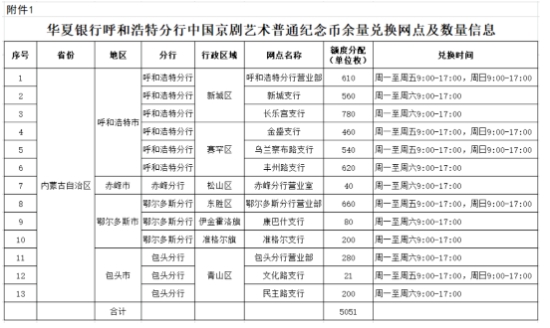 附件:华夏银行呼和浩特分行中国京剧艺术普通纪念币余量兑换网点及数量信息
