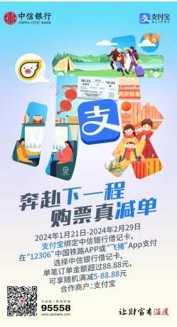 从1月21日开始,中信银行针对客户春节返乡、出游等需求,推出12306、飞猪等平台出行优惠活动。活动期间,通过支付宝绑定中信银行借记卡,在“12306”中国铁路APP或“飞猪”APP下单时使用支付宝快捷支付,并选择中信银行借记卡支付,即可享受单笔订单随机满减优惠。该活动将持续至2月29日,为广大消费者春节出行增添动力。