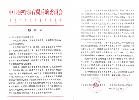 近日,中国民生银行呼和浩特分行收到察哈尔右翼后旗旗委、旗政府的感谢信。信中表示,分行积极响应党中央、国务院、国家金融监管总局的号召,充分发挥自身优势力量,为全旗巩固拓展脱贫攻坚成果与乡村振兴有效衔接作出了突出贡献。