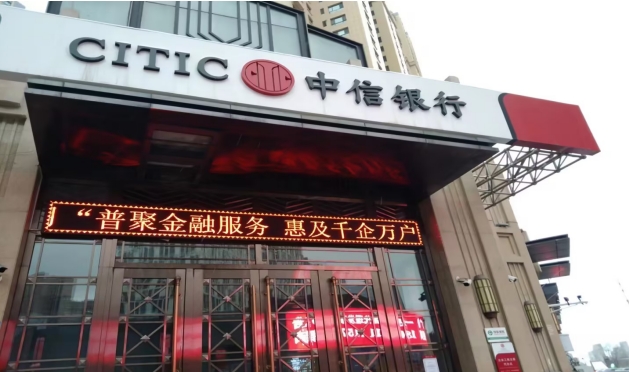 中信银行营业网点LED屏播放“普惠金融推进月”宣传口号