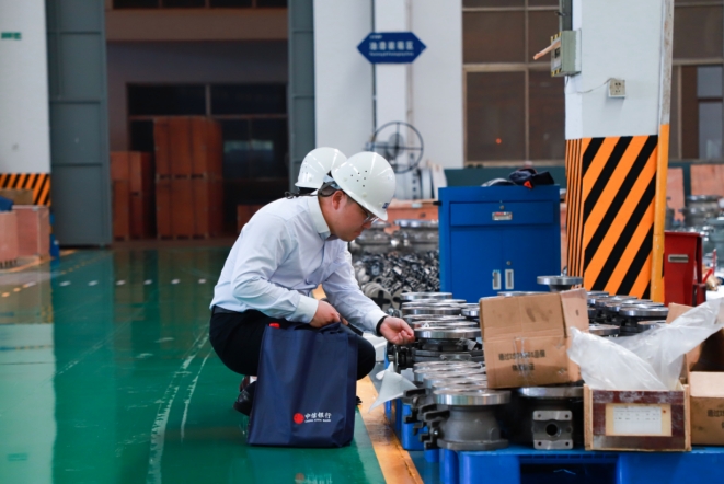 图注:江苏盐电阀门有限公司,是集科研、生产、销售于一体的高品质工业阀门专业制造商,入选国家级专精特新“小巨人”企业。图为中信银行南京分行辖内盐城分行客户经理在车间实地调查,为客户提供授信支持,助力客户做大做强,拓展海外市场。