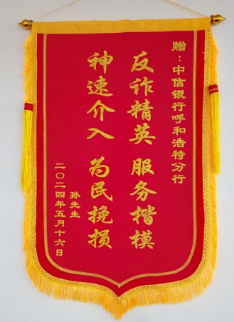 近日,一名电信网络诈骗受害人将一面印有“反诈精英,服务楷模,神速介入,为民挽损”的锦旗送到中信银行呼和浩特分行,感谢银行员工与公安机关合力帮其挽回了49.88万元的资金损失。