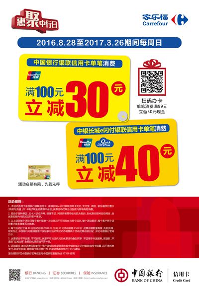 2016年8月28日-2017年3月26日,中国银行银联信用卡客户到全国家乐福指定门店消费: