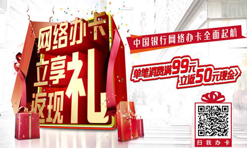 即日起至12月31日通过中国银行网络渠道,包括:官网首页“在线申请信用卡”、“中国银行信用卡”微信公众号、“缤纷生活”APP 或扫描二维码(右侧图片),成功办理信用卡的客户且其中一笔刷卡消费满等值人民币99元,即可获得50元人民币现金返还。每名客户最多获得一次奖励。