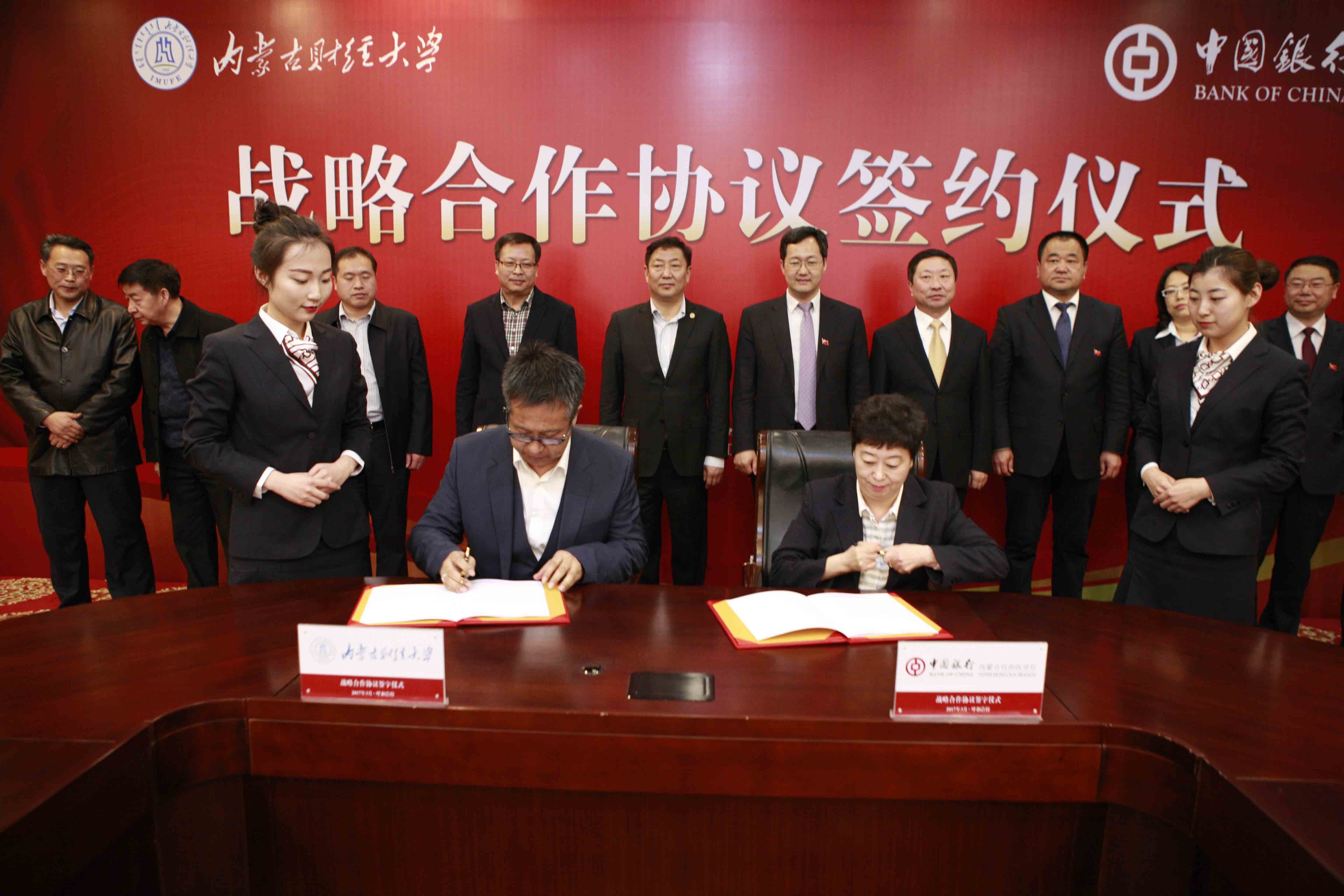 中国银行内蒙古分行资深客户经理雲雯妍、内蒙古财经大学副校长金桩分别代表双方签署《战略合作协议》。